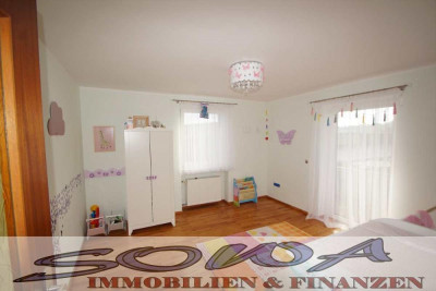 Im Obergeschoss befinden sich die zwei Kinderzimmer und das Schlafzimmer, ein Ankleidezimmer sowie ein Bad mit Badewanne und Dusche.