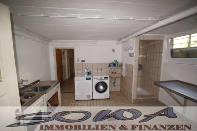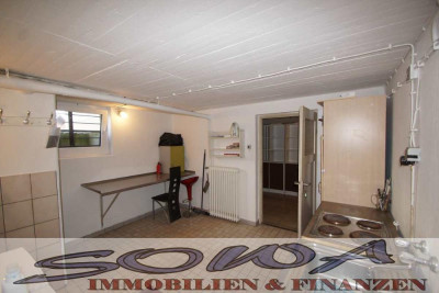 Das Haus ist komplett unterkellert und kann bewohnt werden. Hier finden sich Anschlüsse für eine Küche, Einrichtung für ein Büroraum mit separater Toilette, der Heizungsraum, Waschraum und noch 2 Räume als Stauraum.