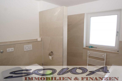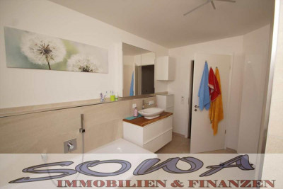 Das Badezimmer ist ein Highlight: begehbare Dusche, Badewanne und Toilette, alles modern und stylisch.