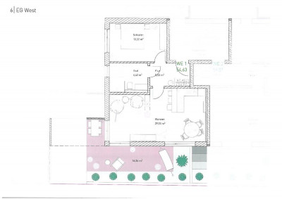 Die Terrasse der westlichen Erdgeschosswohnung ist als kleine Ruhe Oase zu sehen. So wird der Außenbereich der Wohnung 1 getrennt von den restlichen Bereichen, lediglich ein Tor zu Ihrem Terrassenstellplatz lässt Sie die Terrasse zur Außenwelt öffnen. Der darüber liegende Balkon dient weiterhin als Überdachung eines Teilbereichs der Terrasse.
