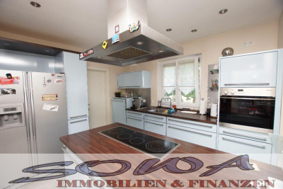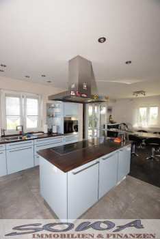 Die offene moderne Wohnküche incl. Miele Herd, Küppersbusch Geschirrspüler sowie Samsung Kühlschrank mit Eiswürfelspender geht offen über den Wohn-/Essbereich. In diesem befindet sich ein hochwertiger Edelstahl Holzofen mit Glasscheibe der Marke Spartherm welcher für einen gemütlichen Tagesausklang sorgt.