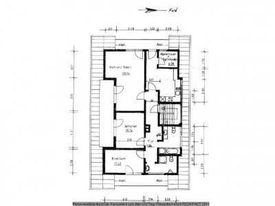 3-Zimmer-Wohnung im Dachgeschoss eines 5-Familienhauses, welches Kellergeschoss, Erdgeschoss, Obergeschoss und Dachgeschoss enthält. Das Haus wurde etwa 1972 erbaut und etwa 1994 um die Dachgeschosswohnung aufgestockt.Raumaufteilung:Wohn- und Esszimmer, Schlafzimmer, Arbeitszimmer, Küche mit Einbauküche, Diele, Vollbad, Duschbad mit WC, Abstellraum und 3 Balkone.Die Wohnfläche beträgt etwa 102 m².Zur Wohnung gehören ein privater Kellerraum, ein Pkw-Stellplatz sowie das Mitbenutzungsrecht an einem gemeinschaftlichen Trockenraum.