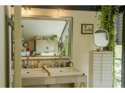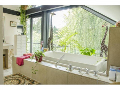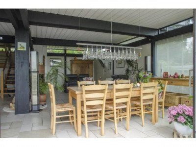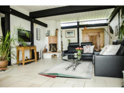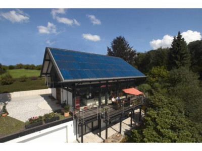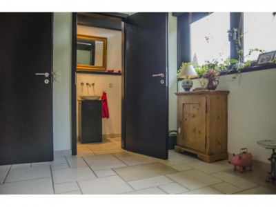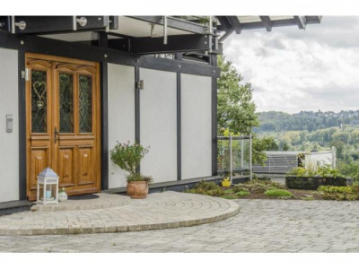 Dieses moderne Niedrig- Energiehaus der Firma Flock mit Einliegerwohnung lässt keine Wünsche offen.Das Flock-Fachwerk- Landhaus verfügt über insgesamt 2 Etagen und eine Einliegerwohnung im Untergeschoss. Man betritt die Wohnebene des Hauses über eine Diele. Dort abgehend befindet sich ein kleines Zimmer, welches zur Zeit als Bibliothek genutzt wird, aber welches sich durch das angeschlossene, kleine Duschbad auch sehr gut als Gästezimmer anbieten würde. Verfolgt man die Diele weiter, erreicht man den großen Wohnraum mit Essbereich und angeschlossener, offener Küche. Die Miele- Küche mit Kochinsel ist mit allen Elektrogeräten ausgestattet und lässt jedes Kochherz höher schlagen. Von dort aus gelangt man auch auf den ca. 25m² großen Balkon mit Südlage und unverbaubarem Ausblick auf das Landschaftsschutzgebiet. Im Wohnzimmer befindet sich außerdem ein Kaminofen, der an kalten Tagen für eine sehr kuschelige Atmosphäre sorgt.Über eine schöne Holztreppe gelangt man von der Diele aus nach oben in den Schlafbereich des Hauses. Dort befinden sich insgesamt 3 Schlafzimmer und ein exklusiv ausgestattetes Badezimmer mit Dusche, Wellness- Badewanne und einem abgetrennten WC. Im Untergeschoss, welches man vom Wohnraum aus über die Holztreppe oder auch über einen separaten Eingang erreicht, befinden sich 3 Büroräume, welche auch gewerblich genutzt werden können. Auf dieser Etage befindet sich auch ein Duschbad. Der Heizungsraum mit der Solaranlage, der Wärmepumpe und der Anlage für die Fußbodenheizung ebenso wie der Waschraum befinden sich auch auf dieser Etage.Von dort aus gelangt man auch in die geräumige Doppelgarage, die problemlos mit 2 mittelgroßen Fahrzeugen genutzt werden kann. Das Untergeschoss kann auch vom restlichen Wohnraum mittels einer Wand abgetrennt werden und somit als Einliegerwohnung genutzt werden. Die Anschlüsse für eine Küche sind dort vorhanden. Auch gibt es dort eine sichtgeschützte Terrasse mit einem kleinen Teich und einem kleinen Gartenhaus.Weitere Informationen zum Energiebedarfsausweis: Baujahr: 2005, Energieeffizienzklasse: D
