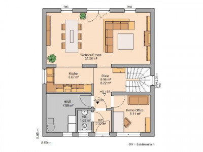 Erleben Sie das Gefühl zu Hause zu sein!Durch den Windfang betreten Sie das Haus und gelangen in den repräsentativen Flur. Das dahinterliegende, helle Wohn- und Esszimmer bietet viel Platz für einen großen Esstisch und eine gemütliches Sofa. Durch die bodentiefen Fenster hat man einen freien Blick in den Garten. In der offenen Küche macht das Kochen besonders viel Freude. Dieser familienfreundliche Bereich wird Ihnen ebenso zusagen wie der zusätzliche Wohnraum im Erdgeschoss. Gestalten Sie diesen ganz nach Belieben als Arbeits- oder Lesezimmer bzw. als Gästequartier.Über die attraktive Treppenkonstruktion gelangen Sie ins Dachgeschoss, in dem sich neben 3 Schlafräumen ein praktisch geschnittenes Familienbad befindet. Zur Gartenseite hin öffnet sich eine Panoramagaube, die einen herrlichen Ausblick ins Grüne ermöglicht. Dies ist der perfekte Ort zum Entspannen.Dieses Haus wird nach Ihren individuellen Wünschen geplant und ausgestattet!