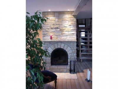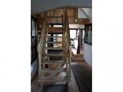Neben dem Kamin geht die Treppe zum OG ab,
