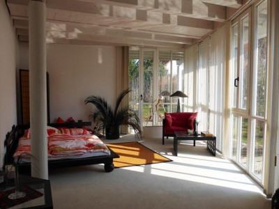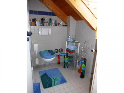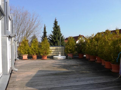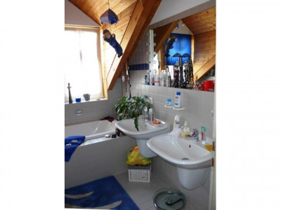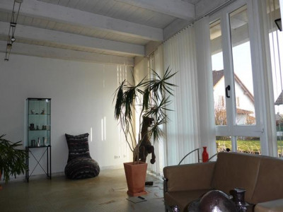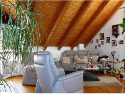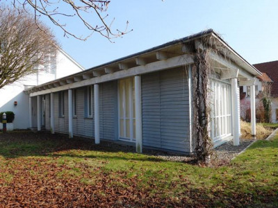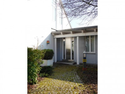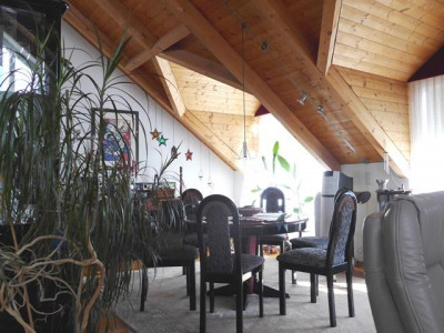 Umrahmt von einem wunderschön gestalteten Garten mit großer Teichanlage finden Sie ein Domizil mit besonderen gestalterischen und bauphysiologischen Qualitäten. Eine winterfeste Teichanlage schmiegt sich an das Bürogebäude an. Von den Büros, der Gästewohnung und den Terrassen hat man idyllische Ausblicke auf den Teich. Dieser hat eine ausreichende Wassertiefe, sodass die wertvollen Koikarpfen darin überwintern können. Besucher erreichen das Wohnhaus über aufwendig gepflasterte Wege.Vor den Garagen stehen ca. 4 Stellplätze zur Verfügung.Aufgrund seiner durchdachten Grundrissgestaltung und der hochwertigen Ausstattung wird das im Jahre 1992 errichtete Wohn- und Bürohaus auch gehobenen Ansprüchen gerecht. So wurden alle Eingangsbereiche und Treppen mit hellem italienischem Marmor ausgelegt, der zum Teil diagonal verlegt wurde. Im Empfangsbereich sorgt eine Lichtkuppel für zusätzliche Helligkeit. Das Gesamtobjekt ist wie folgt aufgeteilt:Im Erdgeschoss befinden sich die Büroräume (ca. 85 m²) bestehend aus Empfangsbüro, Chefbüro, Mitarbeiterbüro, Teeküche, einem hell gefliesten WC, dem Kopier- und einem Archivraum. Die angenehme Raumhöhe von ca. 3,20 m und die bodentiefen Fensterelemente sorgen für ein gutes Raumklima und viel Licht.Weiter ist im Erdgeschoss eine ca. 34 m² große Gästewohnung mit Ausgang auf die Gartenterrasse untergebracht. Auch hier bieten die bodentiefen Fenster herrliche Ausblicke auf Teich und Garten.Im Erdgeschoss des Hauptgebäudes sind 4-6 Kfz.-Stellplätze untergebracht. Die Garage ist beheizbar und komplett gefliest.Im Obergeschoss befindet sich die luxuriös gestaltete und ausgestattete Hauptwohnung. Beim Betreten öffnet sich der Blick bis zum mit Holz verkleideten Dach. Ein Raumgefühl, das Geborgenheit und gleichzeitig Leichtigkeit vermittelt. Die Wohnung besteht aus Garderobe, Küche mit Einbauküche, Wohnen, Schlafen, Kinderzimmer, Bad mit Wanne, WC und 2 Waschbecken und einem weiteres Duschbad mit WC. Eine große Dachterrasse ergänzt das schöne Objekt. Das Hauptgebäude ist komplett unterkellert. Hier stehen umfangreiche Lagerräume, Heizungskeller für die Gasheizung und die Anschlussräume zur Verfügung.