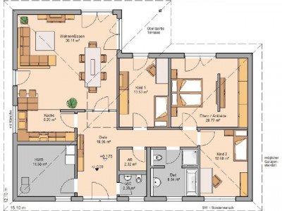 Kern-Haus bringt Sie in die eigenen vier Wände! Kern-Haus bietet mit dem Bungalow Balance ein Traumhaus mit vielen Qualitäten - und alles auf einer Ebene. Der praktisch geschnittene Grundriss bietet zwei Kinderzimmer, ein Schlafzimmer mit Ankleidebereich und ein großes Wohn- und Esszimmer mit offener Küche. Eine überdachte Terrasse lädt zum Genießen und Entspannen mit Freunden ein. Große Fensterflächen, die für lichtdurchflutete Wohnräume sorgen, schenken der Fassade ein ganz besonderes Aussehen.Dieses Haus wird nach Ihren individuellen Wünschen geplant und ausgestattet!