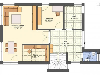 Unser "N 160" besticht durch seine außergewöhnliche Architektur. Im Erdgeschoss befindet sich der großzügige Wohn-/Essbereich mit angrenzender offener Küche. Von der Diele aus gelangen Sie in das Gästezimmer bzw. Büro. Zudem befinden sich in dieser Etage ein Gäste-WC mit Dusche und ein Haustechnikraum.