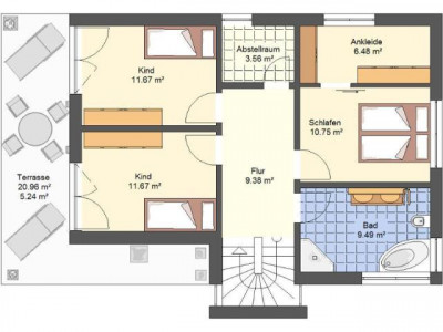 Im Dachgeschoss stehen Ihnen drei geräumige Schlafzimmer, eines davon mit Ankleide, zur Verfügung. Die zwei aneinander grenzenden Schlafzimmer führen auf die aussichtsvoll geprägte Terrasse in L-Form. Auf der Etage befinden sich außerdem ein geräumiges Badezimmer sowie ein Abstellraum.