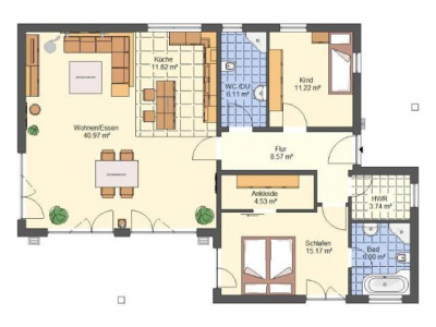 Das Leben in einem Winkel-Bungalow hat viele angenehme Seiten. Alles spielt sich auf einer Ebene ab. Jeder Raum ist schnell und ohne Hindernisse erreichbar und das Treppensteigen entfällt. Was sich auf der Fläche dieses Hauses alles unterbringen lässt, ist schon bemerkenswert. Der Gang durch die Räume macht dies deutlich. Dieses Haus verfügt über ein Wohn-/Esszimmer mit offener Küche, die jedem Anspruch gerecht wird. Das Wohnzimmer mit den bodentiefen Fenstern gibt freien Blick in Ihren Garten und ermöglicht den Zugang zur Terrasse. Man muss nicht hoch hinaus um angenehm zu wohnen.