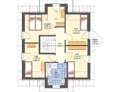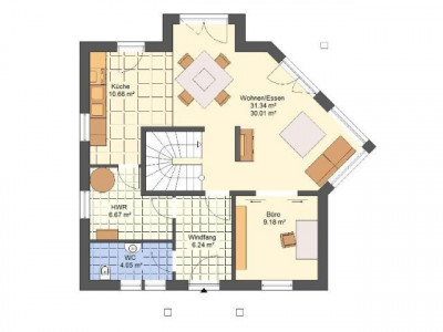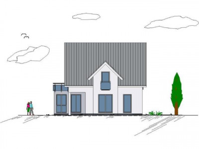 Ein "Zwerchgiebel" zieht von außen wie von innen alle Blicke auf sich und garantiert ein besonderes Raumerlebnis und jede Menge Platz. Der geräumige Wohn-, Ess- und Küchenbereich bildet den Mittelpunkt im Erdgeschoss und spiegelt das großzügige Raumkonzept wider. Die Außenansicht ist durch eine stilvolle Geradlinigkeit geprägt.