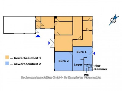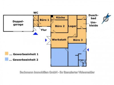 Dieses Objekt wird über BACHMANN Immobilien im Alleinauftrag angeboten.Zum Verkauf steht ein ca. 779 m² großes Gewerbe-Eckgrundstück mit zwei Zufahrten im Bezirk Pankow. Das sich in einem Eckhaus befindliche Bürogebäude/ Werkstatt/Lagerbereich/Kaltlager hat eine Nutzfläche von ca. 249 m², der derzeit von zwei Firmen genutzt wird. Das im Jahr 1979/1983 errichtete Gebäudeteil I verfügt über einen Vorraum mit WC, einen Bürobereich mit 2,54 m Raumhöhe und einer Teeküche. Im hinteren Teil befinden sich Dusche mit WC sowie die Umkleide. Zu diesem Gebäudeteil gehört hofseitig eine in Leichtbauweise errichtete Doppelgarage, die als Lager genutzt wurde. Die Hoffreifläche beträgt hier ca. 340m².Im Gebäudeteil II befinden sich ebenfalls ein vorliegender Bürobereich, ein innenliegender Lagerraum, eine kleine Teeküche mit anschließendem WC-Raum und ein großes Büro, welches zur ruhigeren Seitenstraße hin liegt. Der Außenbereich bietet noch einmal eine Freifläche von ca. 148 m². Jedes Gelass hat einen separaten Stromzähler. Büroräume, Dusche und Toiletten sind beheizbar, die Heizung wird zentral gesteuert.Die Gebäude sind im Deckenbereich alle wärmegedämmt sowie an der Außenfassade mit 50 mm Vollwärmeschutz ausgestattet.