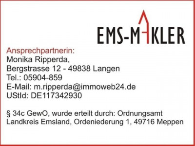 NDIVIDUELL GEPLANT - SCHLÜSSELFERTIG GEBAUT ! in wertbeständiger Massivbauweise.Objektpreis ohne Grundstück ab 275.000 €Wohnfläche 183,48 m²Sollten Sie noch kein Baugrundstück haben, sind wir Ihnen bei der Suche nach einem geeigneten Bauplatz, der Ihren Vorstellungen entspricht, gerne behilflich.Auch helfen wir gerne bei der Baufinanzierung.Die Ingenieure vom BAUCONTOR RIPPERDA stehen Ihnen beratend zur Seite: Von der Bauidee bis zur Schlüsselübergabe Ihres Traumhauses - ob ein Luxushaus oder ein klassisches Einfamilienhaus mit familienfreundlichem Grundriss. Modern Wohnen kann so behaglich sein......Der hier dargestellte Entwurf bildet die Grundlage für Ihre persönliche Hausplanung. Davon ausgehend wird das Haus nach Ihren Wünschen, hinsichtlich Raumaufteilung und Architektur, angepasst - gute Material- und Ausführungsqualität sind Voraussetzung -Eigenleistungen sind selbstverständlich möglich.Wir legen großen Wert auf Ihre Zufriedenheit, deshalb möchten wir gernein einem persönlichen Gespräch mit Ihnen die Details Ihres Hauses erörtern. Rufen Sie uns an unter Tel. 05904/859WEITERE NEUBAUTEN / DHH finden Sie unter www.ripperda.com EMS-MAKLER ist eine registrierte Marke. EMS-MAKLER - Franchisenehmer sind rechtlich selbständige Makler und Unternehmen.Unsere Objektangebotsangaben und sonstige Informationen basieren ausschließlich auf den von unseren Auftraggebern erteilten Auskünften. Eine Haftung für deren Richtigkeit und Vollständigkeit können wir deshalb nicht übernehmen. Es wird damit ausdrücklich keine Prospekt-haftung übernommen. Unsere Angebote sind freibleibend und unverbindlich. Der Auftraggeber hat alle Angaben vor Vertragsabschluß selbst zu prüfen. Irrtum und Zwischenverkauf bzw. Zwischenvermietung bleiben vorbehalten. Es gelten unsere aktuellen AGB.