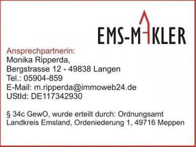NDIVIDUELL GEPLANT - SCHLÜSSELFERTIG GEBAUT ! in wertbeständiger Massivbauweise.Objektpreis ohne Grundstück ab 225.000 €Wohnfläche 162,76 m²Sollten Sie noch kein Baugrundstück haben, sind wir Ihnen bei der Suche nach einem geeigneten Bauplatz, der Ihren Vorstellungen entspricht, gerne behilflich.Auch helfen wir gerne bei der Baufinanzierung.Die Ingenieure vom BAUCONTOR RIPPERDA stehen Ihnen beratend zur Seite: Von der Bauidee bis zur Schlüsselübergabe Ihres Traumhauses - ob ein Luxushaus oder ein klassisches Einfamilienhaus mit familienfreundlichem Grundriss. Modern Wohnen kann so behaglich sein......Der hier dargestellte Entwurf bildet die Grundlage für Ihre persönliche Hausplanung. Davon ausgehend wird das Haus nach Ihren Wünschen, hinsichtlich Raumaufteilung und Architektur, angepasst - gute Material- und Ausführungsqualität sind Voraussetzung -Eigenleistungen sind selbstverständlich möglich.Wir legen großen Wert auf Ihre Zufriedenheit, deshalb möchten wir gernein einem persönlichen Gespräch mit Ihnen die Details Ihres Hauses erörtern. Rufen Sie uns an unter Tel. 05904/859WEITERE NEUBAUTEN / DHH finden Sie unter www.ripperda.com EMS-MAKLER ist eine registrierte Marke. EMS-MAKLER - Franchisenehmer sind rechtlich selbständige Makler und Unternehmen.Unsere Objektangebotsangaben und sonstige Informationen basieren ausschließlich auf den von unseren Auftraggebern erteilten Auskünften. Eine Haftung für deren Richtigkeit und Vollständigkeit können wir deshalb nicht übernehmen. Es wird damit ausdrücklich keine Prospekt-haftung übernommen. Unsere Angebote sind freibleibend und unverbindlich. Der Auftraggeber hat alle Angaben vor Vertragsabschluß selbst zu prüfen. Irrtum und Zwischenverkauf bzw. Zwischenvermietung bleiben vorbehalten. Es gelten unsere aktuellen AGB.