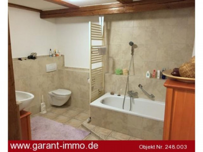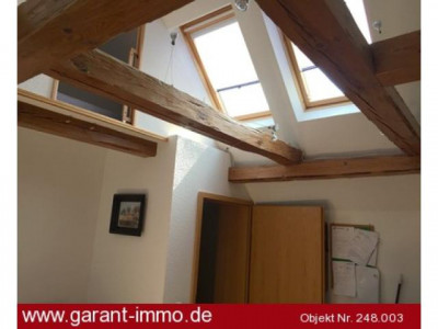 In der 90 qm-Dachgeschoss-Wohnung, die momentan noch vom Eigentümer bewohnt wird, finden Sie viele schöne Details, wie original handbehauene Dachbalken aus dem Ursprungshaus, im Wohnzimmer 100 Jahre altes, aufbereitetes Parkett aus einem ehemaligen fränkischen Tanzsaal, ins Schlafzimmer integrierter, begehbarer Kleiderschrank, ein sehr großzügiges, stilvolles Bad mit Fußbodenheizung.