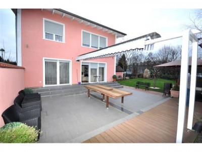 Bei der hier angebotenen Immobilie handelt es sich um ein luxuriös freistehendes Einfamilienhaus in Frankfurt-Griesheim, welches im Jahre 2008 zu 90% neu hergestellt wurde.Zu den ca. 235 m² Wohnfläche steht Ihnen noch ein ausgebauter Kellerbereich der zusätzlich als Büro oder als Au Pair Bereich genutzt werden könnte, zur Verfügung.Weiterhin bietet das Anwesen ein schön angelegten Außenbereich mit riesiger Terrasse die über eine elektrische Markise komplett sonnen-und regengeschützt werden kann, eine Outdoor Barbecue Station, ein Frischwasserbrunnen, sowie 2 Stellplätze vor dem Haus. Ein massives Gartenhäuschen welches auch zukünftig als Sauna umgebaut werden könnte, rundet diese wundervolle Außenanlage ab.Grundsätzlich könnte auf dem Platz der Außenstellplätze eine Doppelgarage gebaut werden Der großzügige Wohn- Essbereich mit offener Küche wird durch einen Podest auf 2 Ebenen unterteilt versehen. Die moderne Einbauküche, die stylische Deckengestaltung mit indirekten Lichtquellen und die Kaminvorbereitung bieten absoluten Wohnkomfort!Im Haus gibt es insgesamt 4 Schlafzimmer, von welchen eines mit einem begehbaren Kleiderschrank ausgestattet ist. Ein weiteres Zimmer befindet sich im Untergeschoß.Neben einem Duschbad im Erdgeschoss befindet sich im OG ein großes Tageslichtbad mit Doppelwaschbecken und Whirlpool.Der Keller mit Waschküche und ein Speicher stellen Ihnen genügend Stauraum zur Verfügung. Das Haus wird über eine moderne und kostensparende Brennwert (Gas) Heizung beheizt.Hinweis: Bei dem Grundstück handelt es sich um ein Erbpachtgrundstück der Stadt Frankfurt. Die jährliche Erbpacht beläuft sich derzeit auf 3.015,- EUR / Jahr. Ein Vorkaufsrecht für das Grundstück erhält der Besitzer des Hauses selbstverständlich.Von dem Wohnbereich aus können Sie Ihre Terrasse und den Garten begehen.Im Erdgeschoss sind die Rollläden elektrisch zu bedienen.Wir freuen uns auf Ihre Kontaktaufnahme!