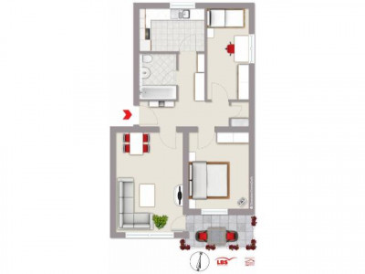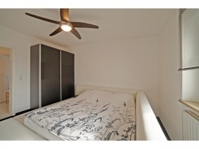 Im rund 18 m² großen Wohnzimmer ist ein Laminatboden in Bambus-Optik verlegt. Schlafzimmer und Arbeits-/Kinderzimmer haben eine Teppichboden. In Flur, Küche und natürlich Bad wurden Fliesen verlegt.