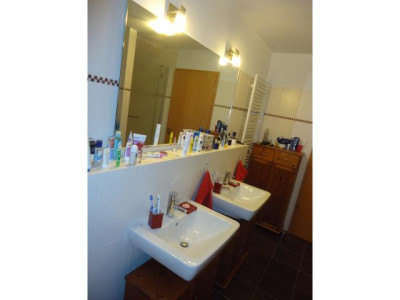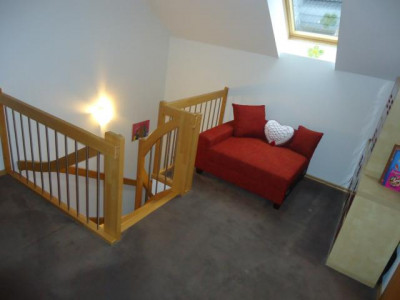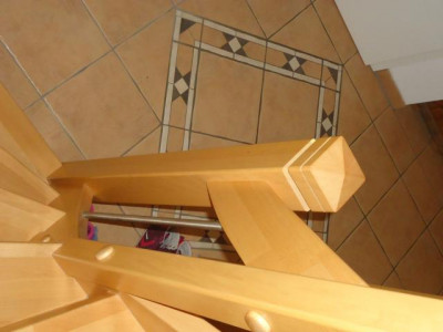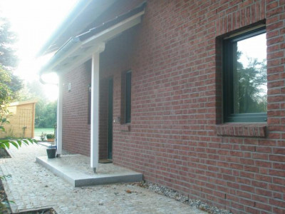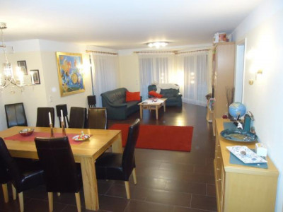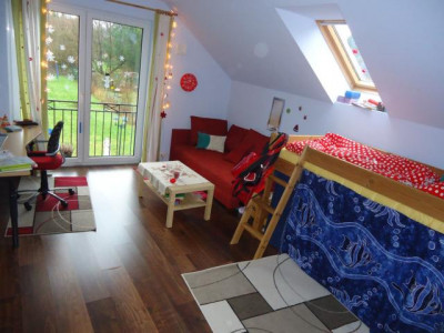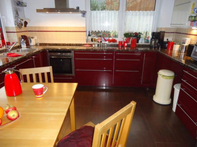 Dieses Ende 2010 fertigerstellte Einfamilienhaus mit 6 Zimmern wurde nach den neuesten energetischen Standards errichtet und wird mit alternativer Energie beheizt (Luft-Wasser-Wärmepumpe). Die durchgehende Fußbodenheizung, dreifach verglaste Fenster, elektrisch gesteuerte Außenrolläden, ein zusätzlicher Balkon und dunkelrot glasierte Dachpfannen charakterisieren das Haus. Sämtliche Zimmertüren des Hauses, im Erdgeschoss in elegantem weiß und im Obergeschoss im Design Buche sind leicht erhöht. Die luxuriöse Küche mit Fronten in Hochglanz und dazu passenden Natursteinplatten sowie der großzügige Wohn-Essbereich sind durchgehend in dunkler Holzoptik gefliest. Im Erdgeschoss befinden sich außerdem das Gäste-WC, der Hauswirtschaftsraum und ein weiteres Zimmer, das ideal als Arbeitszimmer oder Bibliothek genutzt werden kann. Alle Zimmer des Hauses verfügen über einen DSL-Anschluss. In das lichtdurchflutete Obergeschoss gelangt man über eine Buchenvollholztreppe mit beidseitigen Handläufen. Hier befinden sich das Schlafzimmer sowie 3 Kinderzimmer und eine große Empore. Das großzügige Bad ist mit 2 Waschbecken, einem Handtuchheizkörper, einer Dusche und verlängerter Badewanne ausgestattet. Der Dachboden kann in voller Größe als Ablage genutzt werden. Über die Küche gelangt man auf die mit LED Spots beleuchtete Hauptterasse und den großen Garten. Eine zweite Terrasse befindet sich im hinteren Bereich des Gartens unter dem Apfelbaum. Das Grundstück ist vollständig oberflächenentwässert.