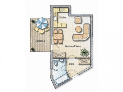 Betongold - seit 30 Jahren die ungeschlagene und sichere Kapitalanlage!Nutzen Sie die Gunst der Stunde mit dieser soliden Investitionsmöglichkeit in begehrter Aussichtslage in Pforzheim. Das 1-Zimmer-Appartement ist bestens geschnitten und derzeit vermietet.Der offene Küchenbereich verbunden mit dem Wohn-Essbereich geben der Wohnung ein großzügiges Raumgefühl.Vom Essplatz gelangt man direkt auf die große Terrasse. Das Bad hat ein Fenster und eine Badewanne.