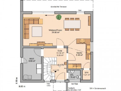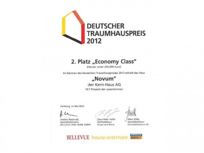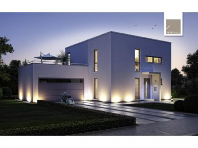 Ihr Traumhaus ist besonders energieeffizient. Edel und zeitlos präsentiert sich das Bauhaus Novum jedem, der Wert auf modernste Architektur legt. Der Design-Entwurf spricht eine klare und kompromisslose Formensprache. Schmale Fenster akzentuieren die Straßenseite. Gartenseitig schaffen die großen Fensterelemente einen fließenden Übergang von innen nach außen, von Wohnraum zu Balkon oder Terrasse. Das Flachdach wirkt schlicht auf der einen, und doch markant auf der anderen Seite des Hauses.Im modernen Inneren setzt sich das Hauskonzept fort. Helligkeit und klare Formen bestimmen das Ambiente. So wohnen Individualisten.Ein Highlight des Entwurfes sind die Wohnräume, die alle über den Zugang zur Gartenterrasse oder dem weitläufigen Balkon profitieren. Das Design-Badezimmer bietet Wellness und Entspannung pur. Die zum Entwurf passende Doppelgarage mit Dachterrasse ergänzt das Haus auf Wunsch perfekt.Dieses Haus wird nach Ihren individuellen Wünschen geplant und ausgestattet!