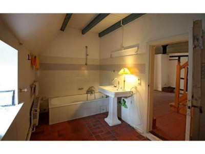 Im hinteren Teil der Diele befindet sich ein geräumiges Vollbad mit Badewanne und altem Waschtisch in Weiß. Steinfliesen, Sprossenfenster und die Holzbalken im Raum verleihen dem Badezimmer einen rustikalen Charakter.