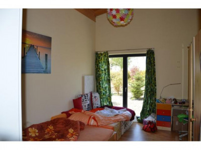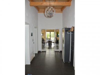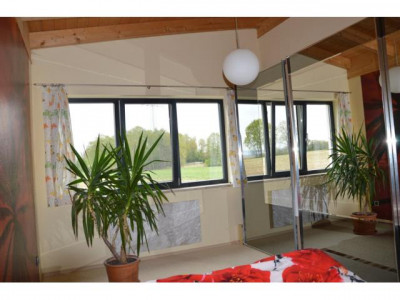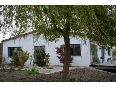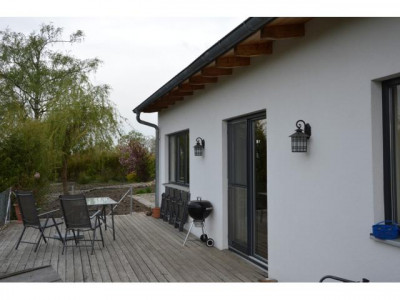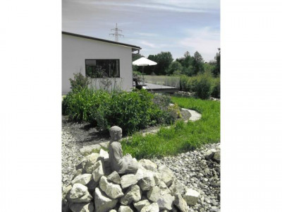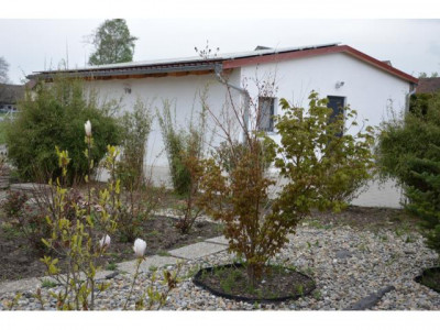 - PROVISIONSFREI-Dieser einmalige Liebhaber-Bungalow wurde in modernster Ziegelbauweise errichtet, mit hohen Räumen und Sichtdachstuhl und ist technisch auf dem neuestem Stand. Beheizt wird mit Elektro-Fußbodenheizung, Marmorheizkörpern und einem Holzofen im großzügigen Wohnbereich. Für das warme Wasser sorgt die Sonne.Es steht am Ortsrand eines Dorfes, in einem riesigen, 1238m² großen, uneinsehbaren Garten der mit einer eingewachsenen, hohen Bambus-Hecke umgeben ist. Durch den Garten fließt ein kleiner Bachlauf zu einem Teich.Der offene, helle, große Wohn-/Küche-/Essbereich ist nach Süden ausgerichtet und führt auf eine große ca 50m" große Terasse. Die Einbauküche sowie der hochwertige Holzofen aus Naturstein mit großem, sichtbarem Feuerraum ist im Preis enthalten.Das Badezimmer hat eine Badewanne sowie eine barrierefreie Dusche.Alle Räume sind mit großen, hochwertigen, pflegeleichten Fließen ausgestattet.Das Haus hat 3 Schlafräume je 15,5m² mit großen Fenstern und neben dem Hauseingang ein Büro und Technikraum mit separatem Eingang. In der 63m² großen Doppelgarage mit el. Toren befindet sich noch eine kleine Werkstatt.Auf dem Haus befindet sich eine PV-Anlage mit 30kWp die eine monatliche Einspeisevergütung von 1.100,-€ einbringt. Diese kann seperat erworben werden. Das Haus könnte auch autark genutzt werden.