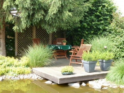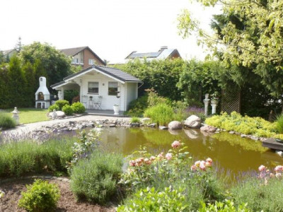 Dieses Einfamilienhaus ist ein wahres Schmuckstück und die Gartenanlage ein Traum. Sehr gepflegt erwartet Sie hier ein Haus mit zwei Schlafzimmern, einem großzügigen Arbeitsbereich und einem Bad mit Wanne im OG. Im Erdgeschoss ist im Eingangsbereich ein zweites Bad mit Dusche nutzbar. Von der Diele ist auch der Abstellraum begehbar, der gleichzeitig als Durchgang zur Garage dient. So gelangen Ihre Einkäufe bei jedem Wetter von der Garage trocken ins Haus. Die Küche ist halboffen mit Theke gestaltet, direkt davor ist Platz für die große Esstafel. Angrenzend zum offenen Wohnzimmer ist der urgemütliche gemauerte Kamin das Highlight. Zwei große Terrassentüren öffnen Ihr Haus zum Garten hin, nach Süd und nach West sind jeweils Terrassen angelegt. Eine weitere Terrasse mit Holzdeck liegt direkt am großen Gartenteich und bildet eine weitere idyllische Ruhezone. Daneben gibt es ein schickes Gartenhaus mit gemauertem Gartengrill. DieRasenfläche verzaubern Sie noch in ein Spielparadies.Bleiben hier noch Wünsche offen?