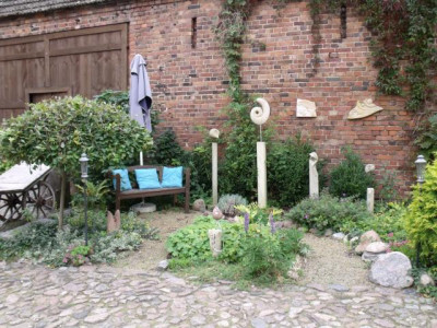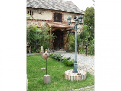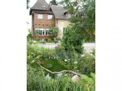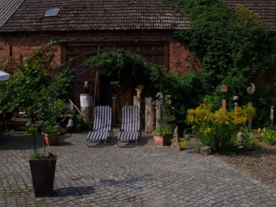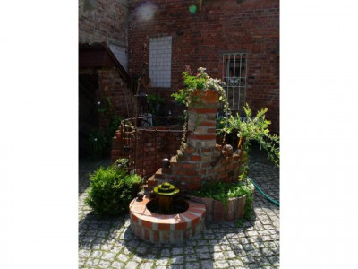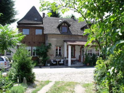 Historischer Drei-Seiten-Hof bestehend aus großem Wohngebäude, Scheune und Stall. ( ehem. Gedreidemühle) in massiver Bauweise errichtet. Die Wohnfläche beträgt insgesamt ca. 290 m2. Ehemals waren 4 Wohnungen vorhanden, zwei im Erdgeschoss und 2 im Dachgeschoss. An das Wohngebäude grenzt ein Wintergarten und ein Turm. Die Gebäude des Hofes wurden u-förmig errichtet. Der Hof bietet aufgrund seiner Größe und Lage vielfältige Nutzungsmöglichkeiten. Zur Zeit befindet sich in den Nebengebäude eine Bildhauerei und eine Kunstgalerie.