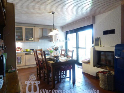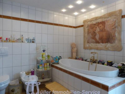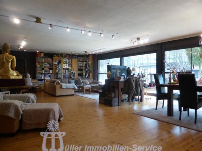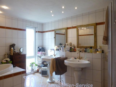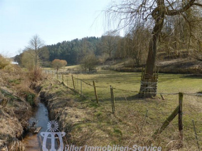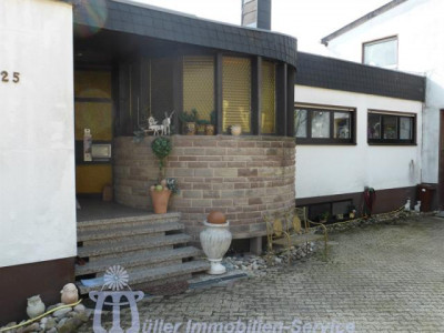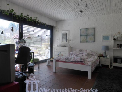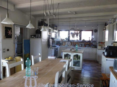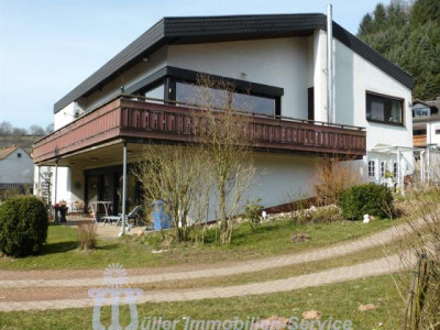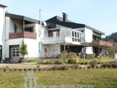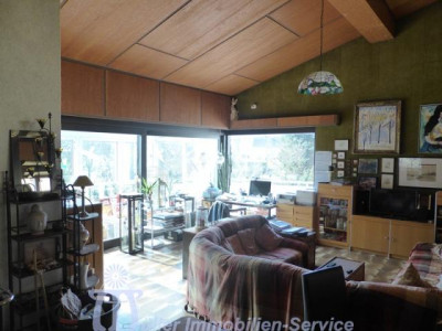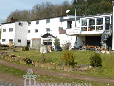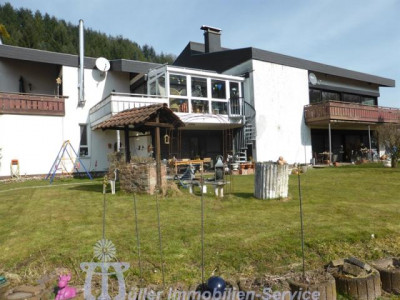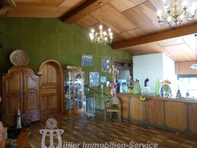 Das großzügige Anwesen steht in idyllischer naturnaher Wohnlage in einem schönen Wiesental mit Bachdurchlauf in der Südwestpfalz auf der sogenannten "Sickinger Höhe" mit jeweils ca. 10-15 Minuten Fahrtzeit bis Homburg, Zweibrücken und Landstuhl; der nächstgelegene Autobahnanschluss an die A6 Richtung Saarbrücken/Luxemburg bzw. Kaiserslautern/Mannheim ist ca. 10-12 km entfernt. Das ca. 7200 m² große Grundstück ist zur Südseite hin orientiert. Der Gesamtkomplex besteht aus dem Wohnhaus (Hauptwohnung ca. 300 m² Wohnfläche) mit Einliegerwohnung (Wohnfläche ca. 240 m²) sowie einem Lager- und (mit Einschränkungen) Produktionsgebäude (Gesamtnutzfläche ca. 1845 m²). Das Grundstück ist im vorderen Bereich gärtnerisch als Rasenfläche mit Ziersträuchern, Blumenrabatten und 2 großen Terrassenbereichen angelegt; im hinteren Bereich befindet sich eine Pferdekoppel mit einer Stallung für 2 Pferde sowie 2 kleineren Ställen für Gänse, Ziegen und Schafe. Das luxuriös ausgestattete Wohnhaus wurde in den Jahren 1979/80 in 2-geschossiger Massivbauweise mit Pultdach und Betonziegeleindeckung errichtet; die Einliegerwohnung im Hanggeschoss mit ebenerdigem Ausgang zum Garten wurde im Jahr 2001 im mediterranen Stil aus- bzw. umgebaut. Beide Wohnungen haben separate Eingänge, allerdings besteht auch ein internes Treppenhaus, durch das die beiden Wohnungen verbunden werden können. Für die Fahrzeuge stehen ca. 6-8 Stellplätze im Freien zur Verfügung; desweiteren befinden sich im Untergeschoss des Lager- und Produktionsgebäudes 3 große auch für LKW oder Wohnmobil geeignete Garagen. Das 3-geschossige Lager- und Produktionsgebäude wurde von 1963 bis 1976/77 in 3 Etappen massiv, weitgehend in Stahlbeton, errichtet. Das Gebäude wird erschlossen über ein Treppenhaus mit einer gefliesten Stahlbetontreppe sowie über einen Lastenaufzug (geeignet für 20 Personen oder 2000 kg). Die Anlieferung erfolgt über eine Rampe bzw. auch über ein ca. 3 m hohes und ca. 4 m breites Aluminium-Sektionaltor. Raumaufteilung WohnhausEG: großzügige Eingangshalle, Gäste-WC, Garderobe mit Einbauschrank, große Wohnküche mit Einbauküche, Essplatz und Kaminofen, großer Hauswirtschaftsraum, Esszimmer mit Erker und eingebautem rundem Tisch mit Sitzbank, Wohnzimmer ca. 90 m² mit Ausgang auf großen umlaufenden Südbalkon, Fernseh- bzw. Musikzimmer, Kaminzimmer mit offenem Kamin, Wintergarten, ein weiterer Südbalkon separater Schlaftrakt: Schlafzimmerflur, großes Elternzimmer, Elternbad (Eckwanne, Dusche, 2 Waschbecken, WC, Bidet), 2 große Kinderzimmer, Kinderbad (Dusche, Waschbecken, WC) HG: geräumige Eingangsdiele, Abstellraum, Gäste-WC mit Duschbad, lichtdurchflutetes Wohn-Esszimmer ca. 73 m² mit Kaminofen und ebenerdigem Ausgang auf ca. 22 m² große überdachte Südterrasse, Wohnküche ca. 28 m² mit heller moderner Einbauküche (Birne-Fronten), Heizkamin, Speisekammer und Ausgang auf eine weitere Terrasse ca. 18 m², großes Kinderzimmer, Kinderbad (Dusche, WB, WC), Elternschlafzimmer ca. 30 m², luxuriöses Elternbad ca. 20 m² (große ovale Wanne, Eckdusche, 2 Waschbecken, Bidet, Hänge-WC, Duravit-Sanitärobjekte) schön ausgebauter Weinkeller mit Gewölbe und Tonröhren, Abstellkeller, Heizungs- und Waschraum, Öllagerraum, Technikraum Raumaufteilung Gewerbeteil2.UG: (ca. 300 m² Nutzfläche) 3 große Garagen, Öllager, Nebenräume, 1. UG: (ca. 719 m² Nutzfläche) Lagerräume EG: (ca. 684 m² Nutzfläche) großer Konferenzraum, 2 Büroräume, Büroküche, Toilettenanlagen, Ausstellungs- und Lagerflächen DG: (ca. 142 m² Nutzfläche) Speicherraum/Lagerfläche ausbaufähig