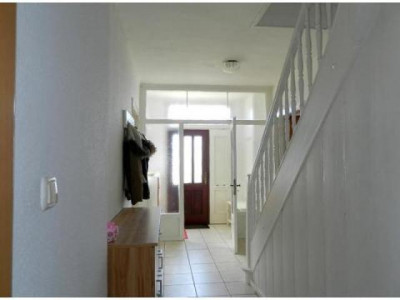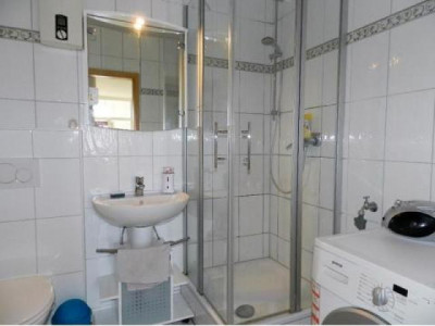 Der eigene Hauseingangsbereich ist unterteilt in Windfang mit Garderobenecke und dem Wohnungsflur.Alle Zimmer sowie die Küche, das Bad gehen von dem Licht durchdrungenen Flurbereich ab. Von der Wohnküche aus gelangt man auf den Gemeinschaftshof mit der angrenzenden Terrasse, in das große Wohnzimmer sowie dem hellen Esszimmer.Ein Waschmaschinenanschluß befindet sich im geräumigen Duschbad im Erdgeschoss dieser Wohnung.Die Massivholz-Treppe mündet im Obergeschoss auf einen schmalen Galerieflur. Von diesem gehen die zwei beinahe gleichgroßen Schlafzimmer mit begehbaren Kleiderschränken ab. Zur Wohnung gehört eine Garage, ein PKW-Stellplatz vor der Tür.Die Wohnung ist mit einem Kellerraum teil unterkellert.Geheizt wird über Strom mit Nachtspeicheröfen.