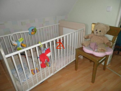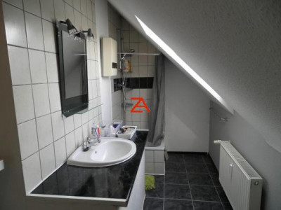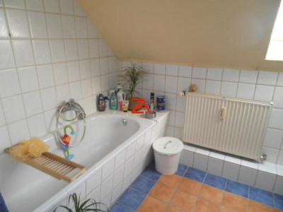 Die Böden sind weitestgehend mit Laminat und PVC Belag ausgelegt. In beiden Wohnetagen gibt es je ein Bad, einmal mit Wanne und eines (DG) mit Dusche.
