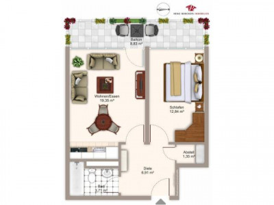 ***Sonnige Aussichten***wohnfreundlicher Grundriss**** 2-Zimmer-Wohnung ca. 48,57 m²* hervorragende Raumaufteilung* Wohnzimmer mit offener Küche* praktische Abstellkammer* mit schönem West-Balkon* im 3. Obergeschoss (ist zugleich Dachgeschoss)* mit Aufzug* Baujahr 1971* Bad mit Waschmaschinenstellplatz (für schmale Waschmaschine)* zusätzlich Waschküche mit Münzgeräten (Waschmaschine und Trockner)* Kellerabteil * übergroßer TiefgaragenstellplatzStaffelmietvertrag: Die Grundmiete erhöht sich jeweils nach Ablauf von 25 Monaten um € 20,00.