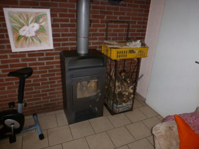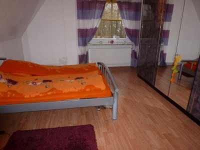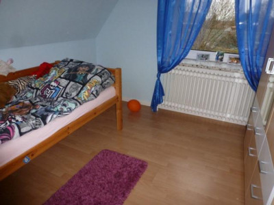 Das OG zeigt das Schlafzimmer, 3 Kinderzimmer sowie den Flur und das Duschbad (zur Zeit Rohbau). Es dominieren Fliesen- (EG) und Laminatböden (OG). Eine helle Einbauküche ist ebenso vorhanden wie ein Ofen im Wohnzimmer.