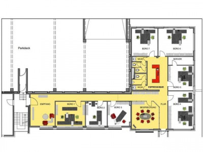 Top Büroetage im obersten Geschoss (2.OG) eines kleinen Bürogebäudes. Gute Belichtung und Belüftung zeichnen die vorwiegend nach Süden orientierten Räume mit Ausblick "ins Grüne" aus. Änderungen sind je nach Bedarf möglich, helle, freundliche Räume mit guter Tagesbelichtung, elektrischer Sonnenschutz, Hohlraumboden mit Bodentanks, CAT 5 / Serverschrank, direkter Zugang zu einem Parkdeck mit Stellplätzen auf gleicher Ebene, Zugang zu einem kleinen Privatpark für die kreative Pause.