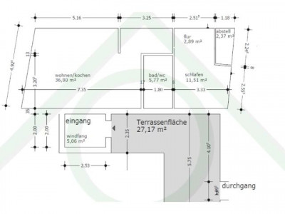 Die Wohnung besteht aus einer Freiterrasse, einer Diele, einem Wohnzimmer mit offener Küche, einem Bad mit Wanne, WC, WM-Anschluss und Fenster und einem Schlafzimmer. Die Wohnung wird grundsaniert und erhält einen neuem Design-Fußbodenbelag (ähnlich Laminat) und wird neu tapeziert/gestrichen. Ein 230 m²-Garten am Haus kann in gemeinschaftlicher Nutzung mit den anderen Mietern des Hauses genutzt werden. Ein Abstellraum befindet sich in der Wohnung. Ein Gemeinschafts-Fahrradraum ist ausserdem vorhanden. Ein schneller DSL Anschluss ist möglich (mit bis zu 16 MBit/s).Endenergieverbrauch des Gebäudes: 107,2 kWh/m²aWohnraum mit offener Küche: ca. 36,8 m²Schlafraum: ca. 15 m² zzgl. kleiner Abstellraum ca. 2,4 m²Wannenbad: ca. 5,8 m²Windfang/Diele: ca. 5 m²Terrasse: ca. 20 m²Miete: Wohnung: 560,- EURNebenkosten: 140,- EURKaution: zwei NettomietenMietbeginn: ab sofort möglich