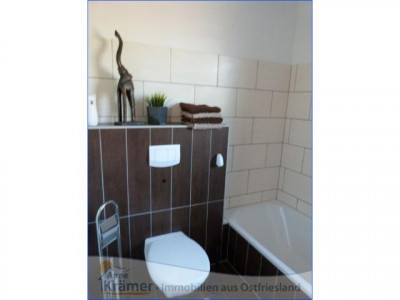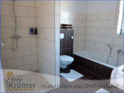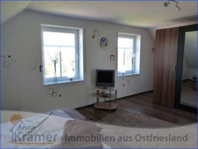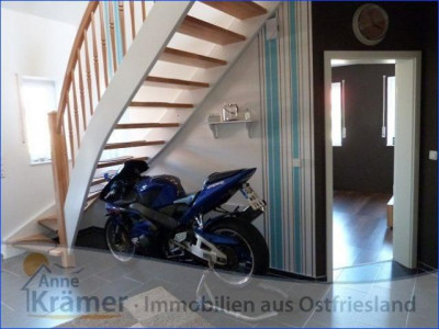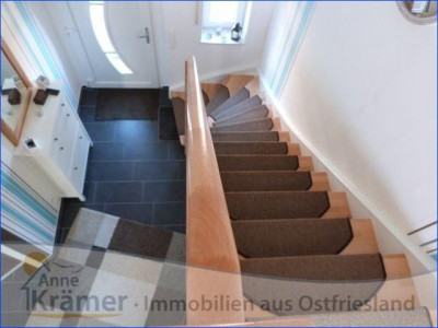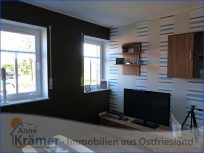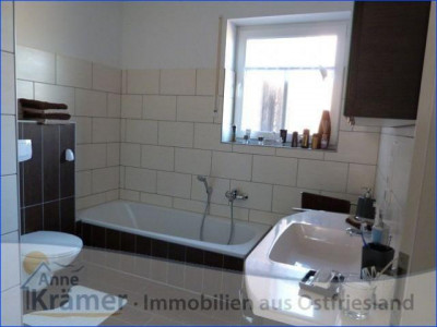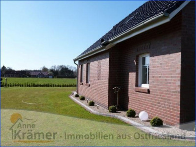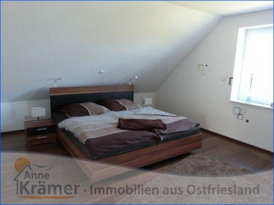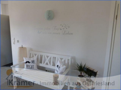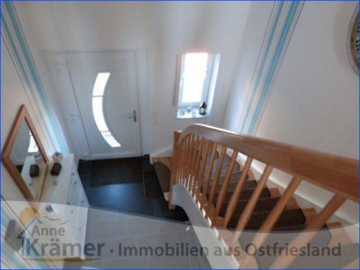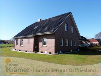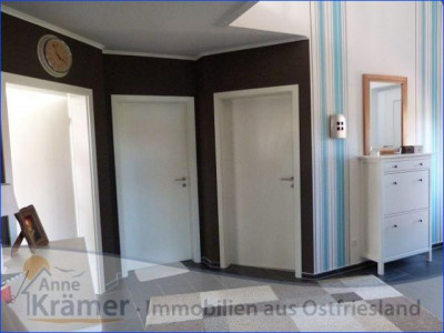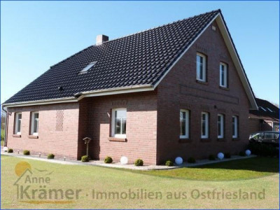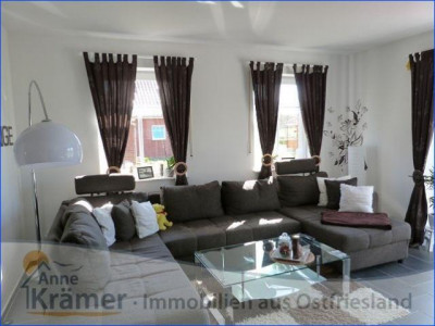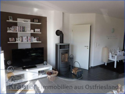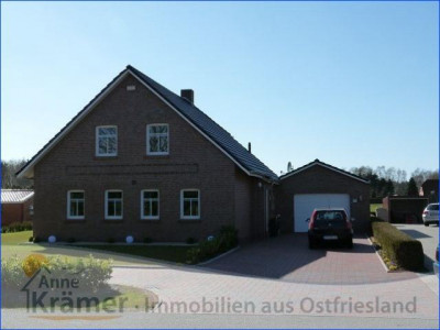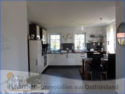 Wir bieten Ihnen hier ein sehr gepflegtes und liebevoll ausgestattetes Einfamilienhaus in einer schönen Lage nahe der Nordseeküste an. Diese Immobilie besticht durch eine tolle Kombination aus Landhaus und modernem Friesenhausstil. Geschmackvoll ausgesuchte Fliesen und hochwertige Laminatbodenbeläge geben diesem Objekt die besondere Note. Alle Räume sind liebevoll, farblich aufeinander abgestimmt. Die dreifach verglasten Fenster sind aus weißem Kunststoff mit innenliegenden Sprossen und Außen Rollläden, ebenso sind die Türen in hellem Holz gehalten. Im Erdgeschoss befindet sich, von der Diele aus begehbar ein Bad mit Waschtisch, Dusche, Toilette und Badewanne. Der angeschlossene Hauswirtschaftsraum ist mit Trockner- und Waschmaschinenanschluss bestückt. Hier befinden sich auch die Gas-Zentralheizung und alle weiteren Versorgungsanschlüsse, sowie ein Zugang in die geräumige Garage. Das Wohnzimmer ist mit einem Kaminofen ausgestattet und verfügt über einen Ausgang auf die Südostterrasse. Der angeschlossene Essbereich in der schönen, hellen Küche mit allen modernen Elektrogeräten lädt zum gemütlichen Beisammensein ein. Praktischerweise befindet sich der Vorratsraum in unmittelbarer Nähe des Kochgeschehens. Von der Einbauküche aus, welche im Kaufpreis enthalten ist führt eine weitere Tür in die Diele zurück, hier befindet sich das ebenerdige Schlafzimmer, welches ein barrierefreies Wohnen im Erdgeschoss ermöglicht. Eine schöngeschwungene Buchentreppe mit weissen Wangen führt in das Obergeschoss. Hier befinden sich ein großes Elternschlafzimmer, ein Kinderzimmer und ein Gästezimmer, sowie ein Bad mit Waschtisch, WC und Dusche. Das gesamte Objekt ist im Erdgeschoss, sowie im Obergeschoss mit einer Fußbodenheizung ausgestattet. Die Außenterrasse mit angrenzendem, pflegeleichtem Garten lädt dazu ein, die Sonnenstunden zu genießen. Die Hauseigene Kläranlage ist für 6 Personen ausgelegt, mit einem Wartungsvertrag versehen und hat den Vorteil der Abwasserabgabeneinsparung.Das 1230 m² große Grundstück ist überwiegend mit Rasen angelegt und bietet noch viele Möglichkeiten der kreativen Umgestaltung. Dieses sehr hochwertige Objekt sollten Sie sich unbedingt ansehen. Bitte vereinbaren Sie einen Besichtigungstermin mit uns.Ein Energieausweis ist in Bearbeitung !