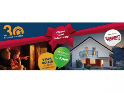 ENDLICH ZU HAUSE im eigenem Traumhaus und dies mit einer Monatlichen aktuellen ca. Rate von knapp 786.- € , ohne Eigenkapitaleinsatz , jedoch abgestimmt auf Ihre Persönliche Situation und Bedürfnisse. Feiern Sie mit diesem einmaligem Jubiläums - Preishammer der Firma Allkauf-Haus unser 30 - jähriges Firmenjubiläum .Als eimaligen Bonus zu diesem Hammerpreis schenken wir Ihnen noch einen neue Marken - Einbaumarkenküche sowie ein Kaminofen hinzu .Diese Angebot ist eine Absolute Sensation und wohl einzigartig in dieser Kombination , mit dem im Preis enthaltenem Traumgrundstück.Handeln Sie jetzt , denn dieses einmalige Angebot zu unserem 30 järigem Jubiläum, in Verbindung mit dem aktuell Historischem Zinstief und der Möglichkeit das ganze ohne Eigenkapital zu finanzieren wird es so nicht mehr geben.Sehr gerne erläutern wir Ihnen in einem persönlichem Gespräch alle Ihre Fragen und Wünsche auch in Bezug auf das Grundstück und der Finanzierungsgestaltung . Nutzen Sie jetzt diese einmaligen Möglichkeiten um Ihren Traum zu erfüllen .SOFORT - KONTAKT : 0160 287 60 65 Büro : 07429 / 408 555E-Mail : klauskahlert@online.deDas Haus wird in Fertigbauweise auf einer im Preis enthaltenen Bodenplatte erstellt. . Ein Keller ist gegen geringen Jubiläums - Aufpreis möglich. Die Raumaufteilung können Sie nach Ihren Wünschen und Ideen verändern. Unser Architekt plant das Haus nach Ihren Wünschen und Vorstellungen. ( Im Preis inbegriffen ).Dieses Haus ist bis auf die Maler , Bodenbelags und Fliesenlegearbeiten komplett nach Ihren Wünschen und Bedürfnisse ausgebaut .Für die noch anfallenden Arbeiten ist sogar das komplette Material und dies noch in einer sehr großen Auswahl enthalten.Sehr gerne beraten wir Sie auch hier in einem persönlichem Gespräch über alle Ihre Fragen und Wünsche .Zuzüglich Baunebenkosten (Anschlußkosten der Einzelnen Versorgungsunternehmen, Erd und Kanalarbeiten , Außenanlagen , u.s.w. ) von ca.30.000 €.