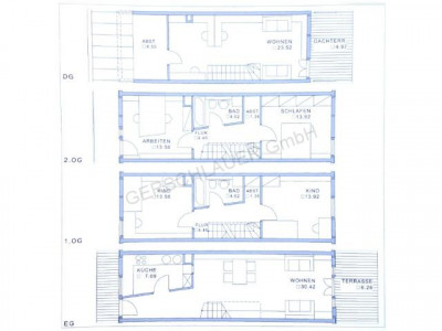 Die 1996 fertiggestellte Wohnanlage besteht aus zwei Baukörpern, die durch einen Gemeinschaftsbereich mit eingeschossigen Nebenanlagen verbunden sind, welcher als Durchgang von der Straßen- zur Gartenseite und zum Kinderspielplatz dient. Bei allen Wohnungen handelt es sich um südorientierte Maisonette-Typen mit innerer Erschließung. Eine untere und eine obere Maisonette-Wohnung kann baulich als Reihenhaus miteinander verbunden werden. Hinter der Haustüre im Erdgeschoss befindet sich eine Diele mit genügend Platz für eine große Garderobe. Neben der Diele liegt gleich die ca. 8 m² große Küche mit großem Fenster. Sie gelangen dann von der Diele aus in das 30 m² große Wohnzimmer, welches sich über eine über die gesamte Wandseite verlaufende Panoramafensterfront weit und hell nach Süden auf die ca. 6 m² große Süd-Terrasse hin öffnet, von der aus Sie in den eigenen schönen Süd-Garten gelangen. Über eine gerade Treppe in der Diele gelangen Sie in das 1. Obergeschoss, in dem Sie zwei rund 14 m² und 13 m² große Schlafzimmer finden, von denen das größere Schlafzimmer sich mittels eines französischen Balkons weit und hell nach Süden in Richtung des eigenen Gartens hin öffnet. Zwischen diesen beiden Schlafzimmern liegt das rund 5 m² große Badezimmer. Auch finden Sie hier auf dieser Etage noch eine rund 1 m² große, sehr praktische Abstellkammer. Über eine weitere gerade Treppe gelangen Sie in das 2. Obergeschoss, welches mit noch einmal zwei weiteren Schlafzimmern und einem dazwischen liegenden Badezimmer genauso geschnitten und ausgerichtet ist wie das 1. Obergeschoss. Über eine gerade Treppe im Flur gelangen Sie in das Dachgeschoss wo Sie ein rund 23 m² großes Studio mit hohem Sichtdachstuhl finden, welches sich über eine Fenster- und Ausgangsfront nach Süden weit und hell auf die rund 5 m² große teilüberdachte Süd-Dachterrasse hin öffnet, von der aus Sie einen sehr schönen Blick über die Gartenlandschaft der Wohnanlage genießen können. Zusätzlich viel Licht erhält dieses Studio über ein großes Dachfensterband hoch oben direkt auf der südlichen Ebene der Dachspitze. Zusätzlich finden Sie hier noch einen ca. 5 m² großen sehr praktischen Abstellraum (z.B. für die Polsterauflagen der Dachterrassen-Möbel). In diesem sehr schönen Haus fühlt man sich sofort sehr wohl.