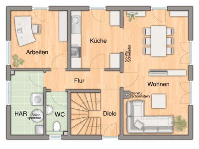 Das Grundstück ist zum Beispiel mit unserem großzügigen "Bodensee 129" bebaubar.In diesem Haus werden Sie sich wirklich wohlfühlen. Im Erdgeschoss lädt Sie das helle und großzügig geschnittene Wohnzimmer zum Verweilen ein. Hier findet die gemütliche Sitzecke ebenso Platz wie ein großer Esstisch. Hohe Fenster ermöglichen den freien Blick in Ihren Garten und auf die Terrasse. Auch die Küche und das angrenzende Arbeits- oder Gästezimmer wirken offen und freundlich. Ein Kleines Gäste-WC macht die untere Ebene perfekt.Oben angekommen, erwartet Sie ein großes Schlafzimmer mit separater Ankleide. Genießen Sie den Platz in Ihrem Town & Country Haus! Auch Kinder- und Gästezimmer bieten viel Freiraum - hier kann sich jeder „ausbreiten“, wie er möchte. Das Badezimmer lädt zum Entspannen ein.Sie wünschen sich mehr Unabhängigkeit beim Energieverbrauch und bei den damit verbundenen Kosten? Kein Problem, das Bodensee 129 ist auch als Passivhaus erhältlich.Auf Wunsch ist dieses Haus auch mit Keller erhältlich.