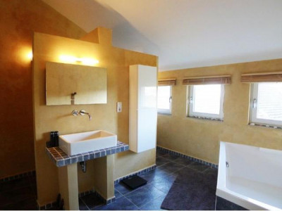Beschreibung:EG:Schlafzimmer, Bad, Keller, HeizungsraumGarageOG:Flur, Wohn-Essbereich mit offener Küche und Ausgang über die Terrasse in den Garten, Büro, Bad mit DuscheDG:Großer Raum mit Ausgang auf den Balkon, 2 Schlafzimmer (jeweils mitAusgang auf einen weiteren Balkon), eines davon mit Ankleide und Zugangzum Bad