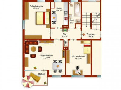 Die Wohnung befindet sich im Obergeschoss und verfügt über Wohnzimmer, zwei Schlafzimmer, Küche, Badezimmer und Balkon.Zusätzlich ist ein separater Kellerraum vorhanden.