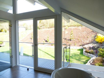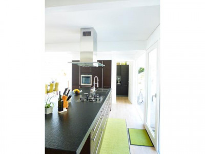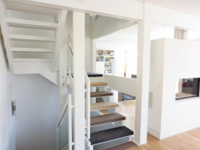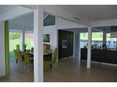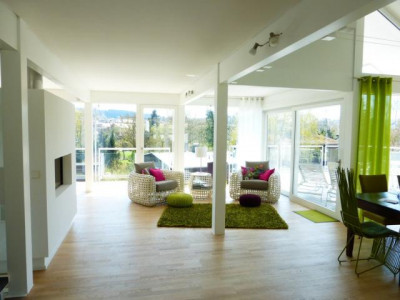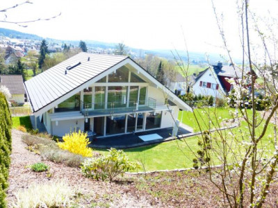Eine durchdachte Architektur mit klaren Linien zeichnet dieses moderne Fachwerkhaus von Davinci aus. Das lichtdurchflutete Haus beeindruckt durch sein offenes Ambiente und die schöne Aussicht auf Terrasse und Garten. Der Wohnraum gestaltet sich großzügig mit offener Küche, Kamin und Esszimmer in einer Abschleppung. Ebenfalls auf dieser Ebene ist das Gästezimmer mit direktem Anschluss an ein großräumiges Gäste WC.Die Panoramafenster bilden einen nahtlosen Übergang zu Balkonen und zur Terrasse die zum Entspannen und Entertainen einlädt. Der liebevoll gestaltete Garten in Hanglage verfügt über zwei Rasenebenen umgeben von Blumenbeeten und Sträuchern die zu unterschiedlichen Jahreszeiten ihre Blütenpracht zeigen. Der Rasen wird vom Auto-Mower immer auf gleicher Länge gehalten.Der Garten wird auch durch eine Treppenanlage auf der Garagenebene erreicht.Durch die Doppelgarage hat man direkten Zugang zum Souterrain, welches auch den Eingangsbereich von Außen bildet.Auf dieser Ebene befindet sich eine großzügige Einliegerwohnung mit Bad und Abstellraum . Diese Räumlichkeiten bilden z.Zt. den Bürobereich der Eigentümer. Ebenfalls im Souterrain sind 2 Kellerräume, der Hausanschlußraum sowie die Waschküche.Im Obergeschoß befinden sich die 3 Schlafräume, begehbare Kleiderschränke und 2 Bäder. Das Elternbadezimmer erfüllt höchste Ansprüche mit freistehender Badewanne und offener, begehbarer Dusche. Das Kinderzimmer hat eine Galerie im Giebel des Daches und (sowie alle anderen Zimmer auch) Zugang zum Balkon der einen atemberaubenden Blick auf Taunusstein bietet.