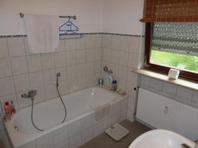 Das helle Tageslichtbad verfügt über Badewanne sowie Dusche und wurde im Jahr 2003 mit hellen Fliesen ausgestattet und renoviert.