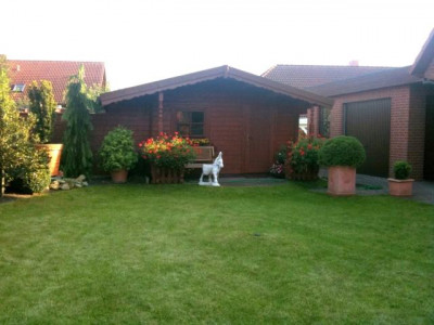 Im hinteren Teil des Grundstückes steht ein Blockbohlen-Gartenhaus aus 70 mm Blockbohlen. Gartengeräte und alltägliche Gerätschaften lassen sich hier mühelos verwahren.