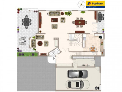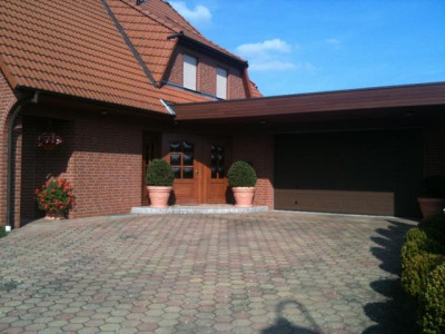 Die Doppelgarage ist an der Frontseite mit einem funkgesteuerten Sektionaltor versehen. Auch das massive Friesentor in der Grundstückseinfahrt wird funkgesteuert. Auf der Rückseite der Garage befindet sich ein Kipptor als zusätzlichen Zugang in den hinteren Teil des Gartens.