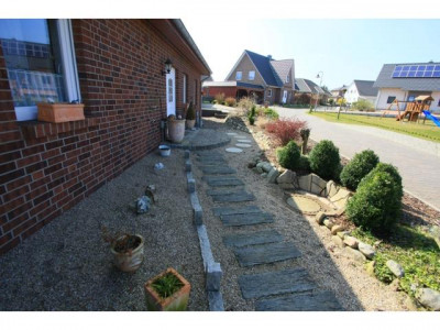 Die Einfahrt und das Carport sind mit Rasengittersteinen versehen. Auf der Zuwegung zum Hauseingang sind Kieselsteine und Eisenbahnschwellen ausgelegt. Vor dem Haus wurde die Beet Anlage mit Granitsteinen eingefasst. Ein weiterer gepflasterter Stellplatz steht auf der rechten Grundstücksseite zur Verfügung.