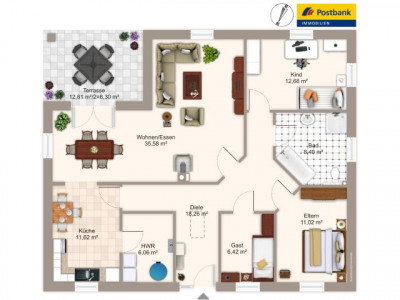 Die Wohnfläche mit seinen ca. 117 m² auf einer Ebene, ist aufgeteilt auf 3,5 Zimmer, Küche und Bad.