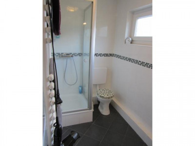 Das Duschbad ist geschmackvoll in weiß/schwarz gefliest.
