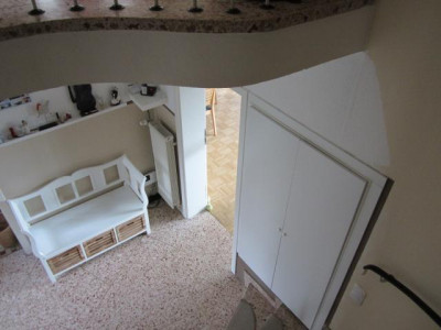 Über einen kleinen Windfang gelangen Sie in den Flur, der geprägt wird durch die Halbwendeltreppe, die in den Keller und in das Obergeschoss führt.