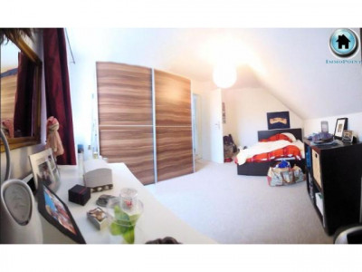 Das Schlafzimmer ist gut dimensioniert und bietet genug Platz für einen großen Kleiderschrank samt Doppelbett und sogar einer kleinen Büroecke.
